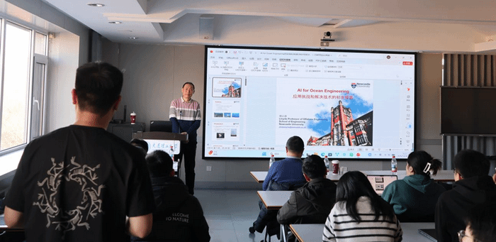 针对当前海洋工程领域人工智能应用面临的数据匮乏挑战,胡教授介绍了一种作为 AI for Ocean Engineering 解决方案的海洋风机数字孪生技术,旨在破解学术界因缺乏风机实测数据而导致的技术瓶颈。该技术体系由四个关键环节构成:首先通过高阶非线性多体耦合动力分析方法奠定力学基础,随后利用水池模型试验获取关键验证数据,进而开发基于人工智能的 SADA 动力性能预报技术,并最终构建集实时监测于一体的数值孪生系统。该方案实现了对复杂不确定环境下结构响应的快速评估与科学定量预测,在提升装备安全裕度的同时,显著降低了海洋风机全寿命周期的实时监测与运维成本。